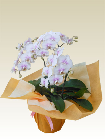 白を基調とした花びらに淡いピンクが入ったミディ胡蝶蘭です。